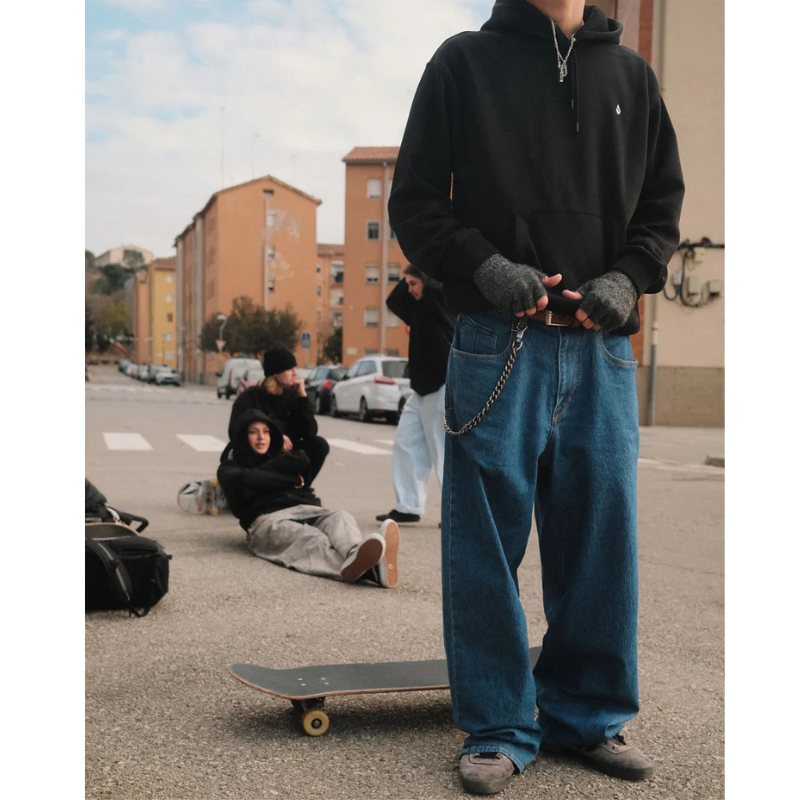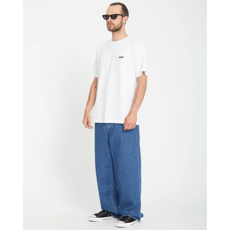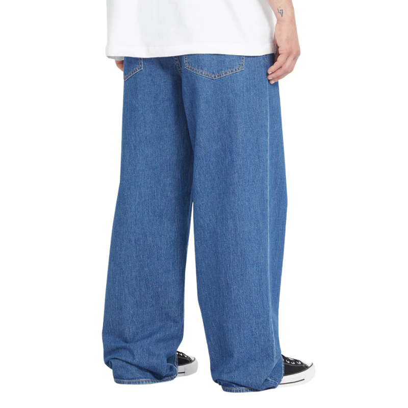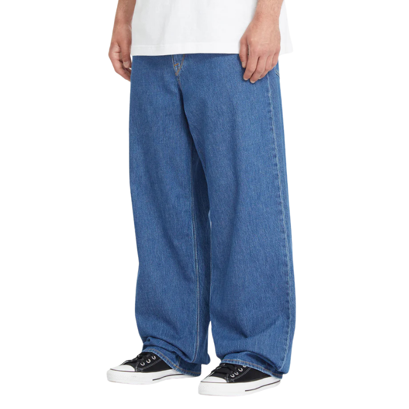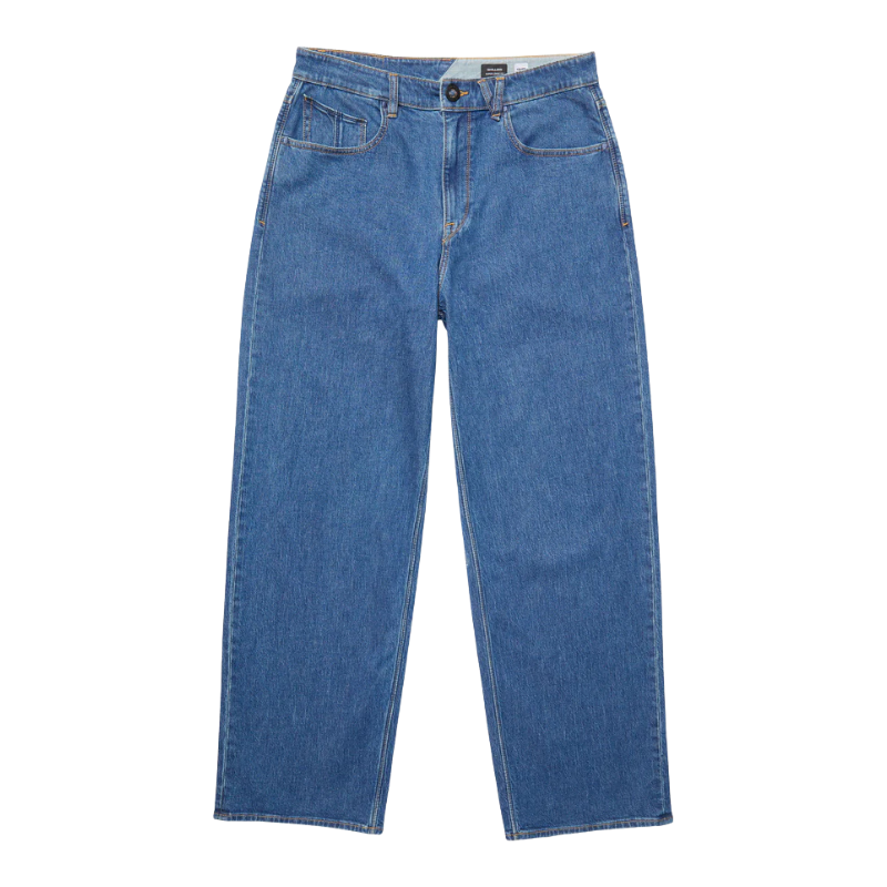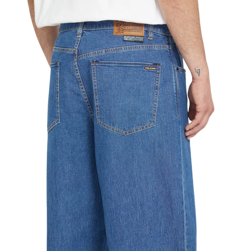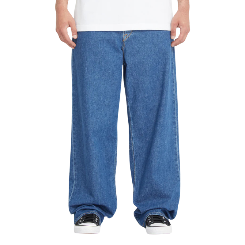 br> - Посадка: Модель имеет сверхсвободный (super loose fit) крой и расслабленную линию талии (relaxed rise), которая сидит ниже пояса.br> - Материал: Изготовлены из 100% хлопка (жесткий, плотный деним), что обеспечивает прочность и долговечность.br> - Дизайн: Классический 5-карманный стиль с ширинкой на молнии и фирменными деталями бренда Volcom, включая вышивку и нашивки с логотипом.
